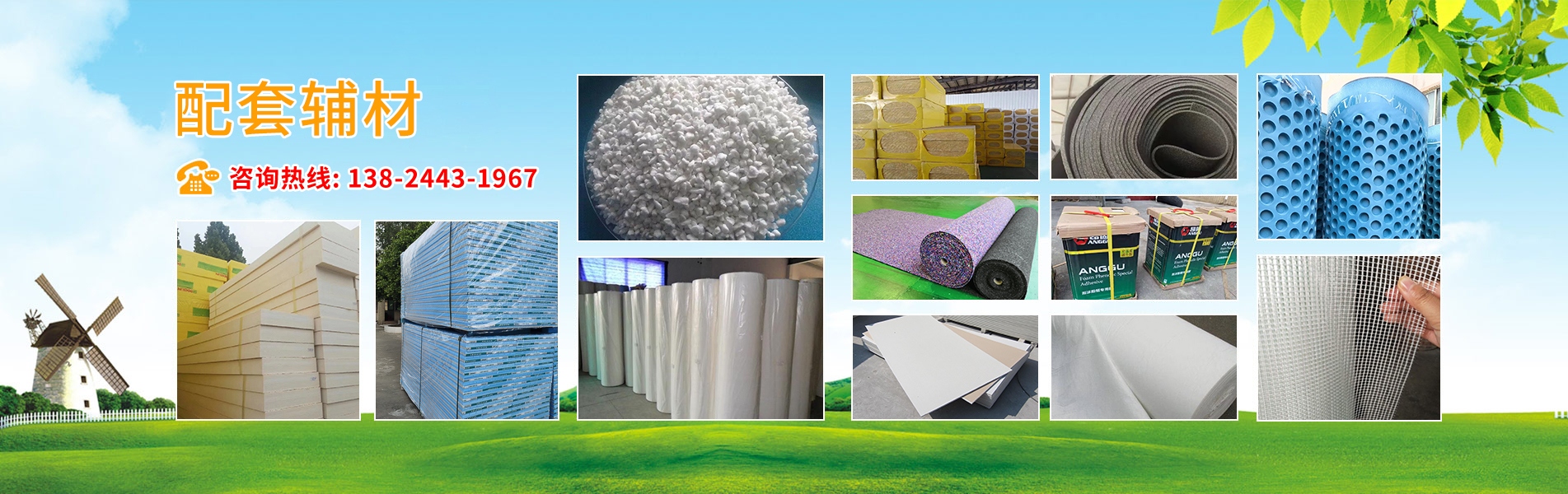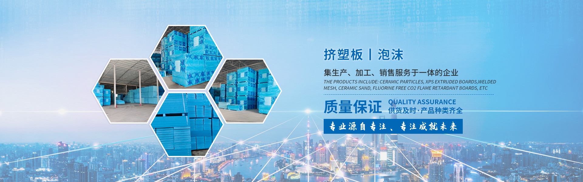 產品有:陶粒、XPS擠塑板、陶砂、無氟co2阻燃板、擠塑復合板。配送材料有:碰焊網、專用膠水、泡沫板、巖棉板、玻璃棉氈、珍珠巖、聚酯無紡布、纖維網格布等。